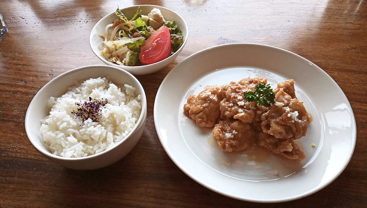 ゆかりのかかったご飯に、サラダとメインの油淋鶏5個