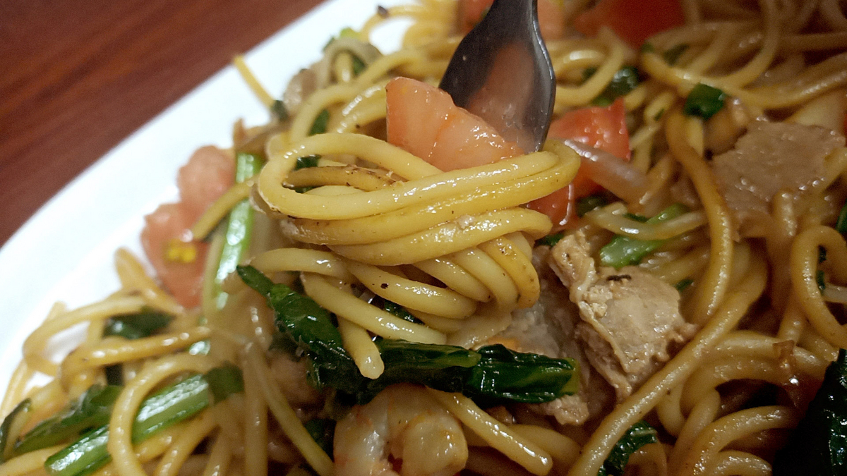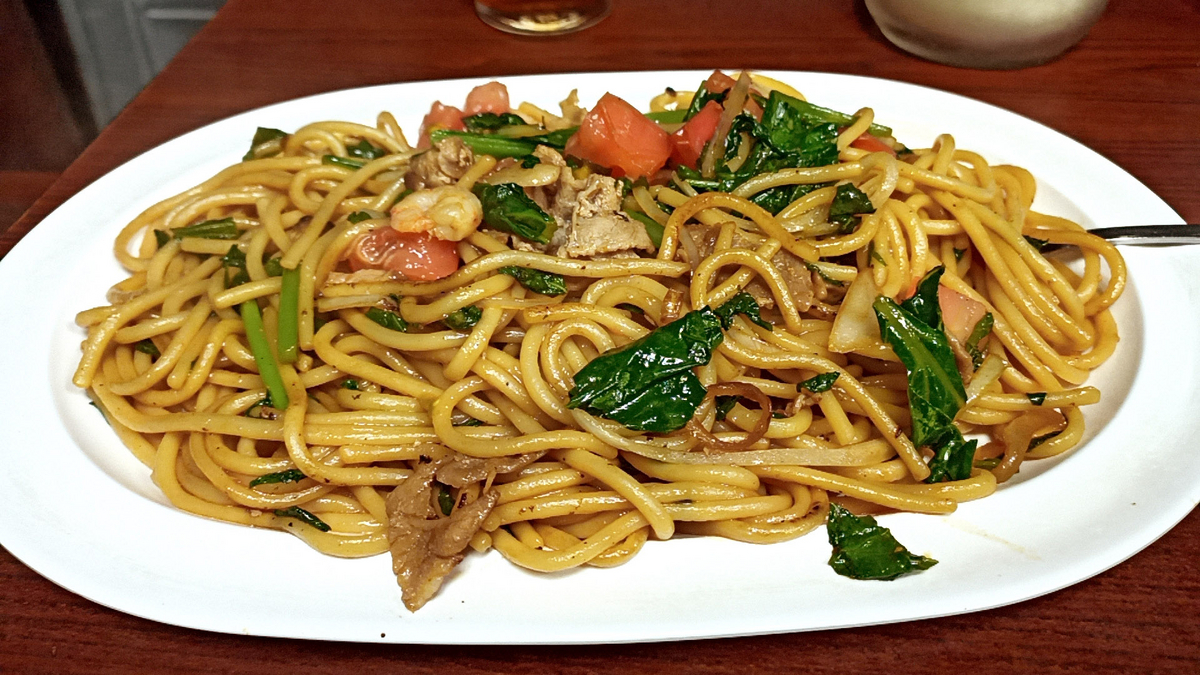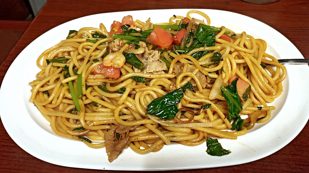 具材は肉、海老、しその葉、トマト、小松菜、シイタケ、玉ねぎ
