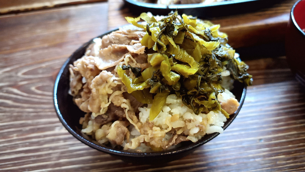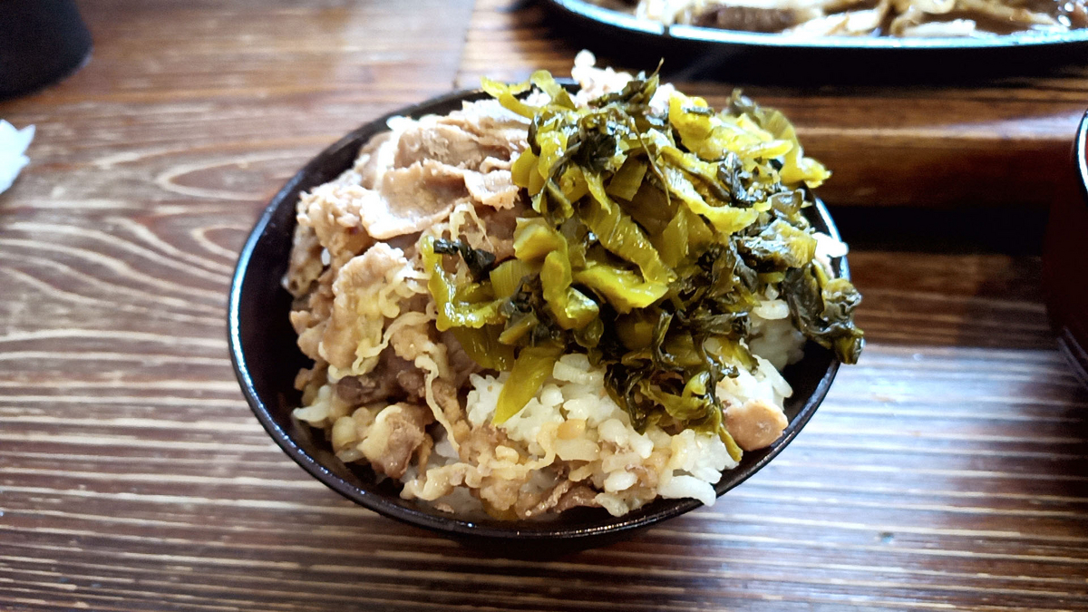肉めしのおかわりは、福岡なので高菜を添えて