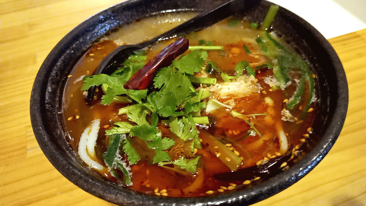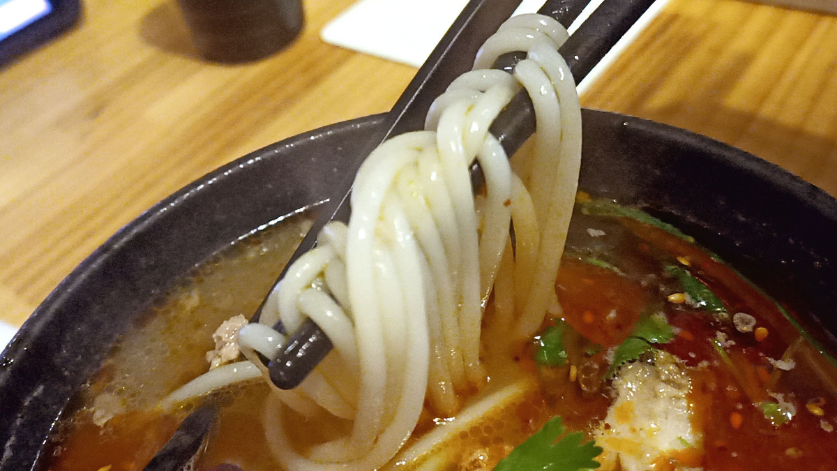 辛味が効いていて、パクチーも乗っているので中国版のフォーのような感じ