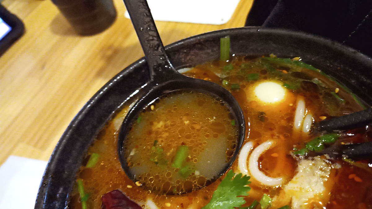 辛口にしたせいか唐辛子が浮いている麻辣米線