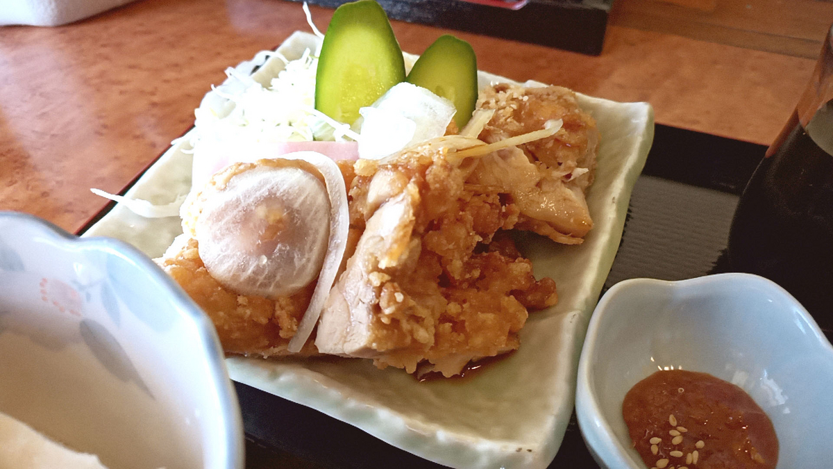 唐揚げは2個ほどで、食べやすいように半分にカットされています