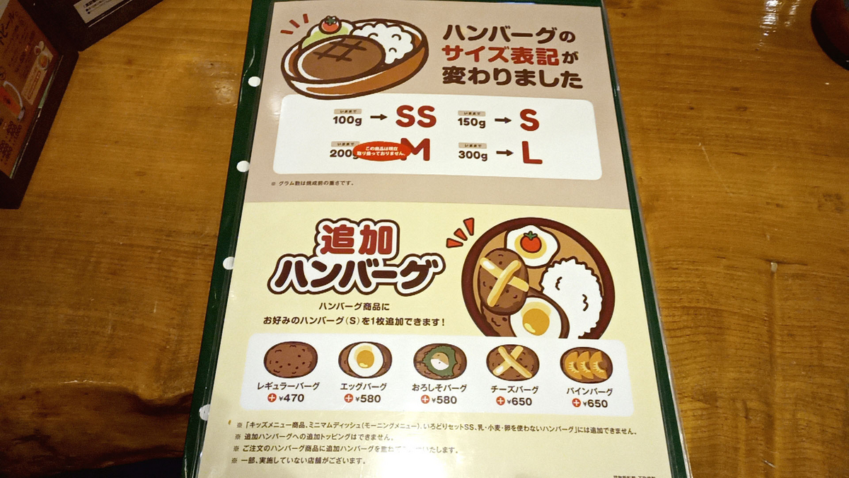 ハンバーグのサイズ表記が変わったとの案内が