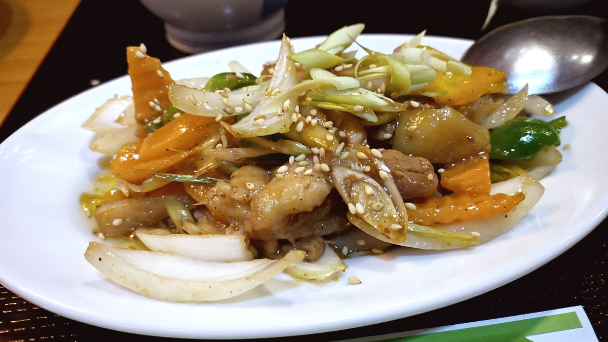 香味野菜が強めに効いている野菜炒めは日本ではあまりないタイプ