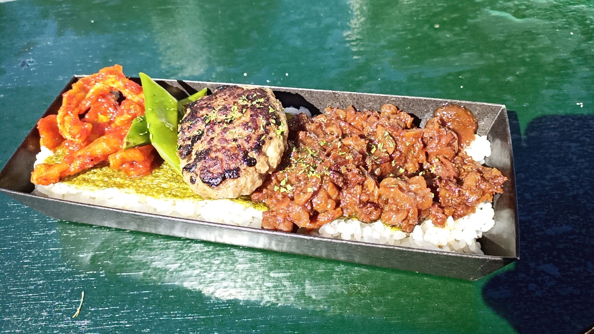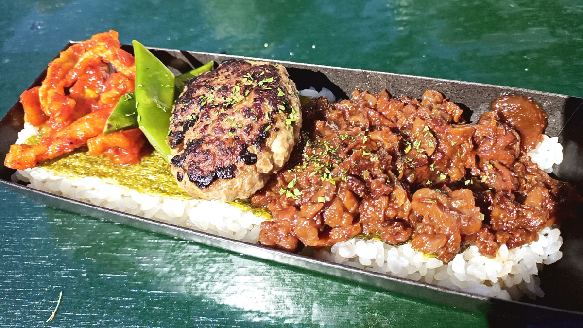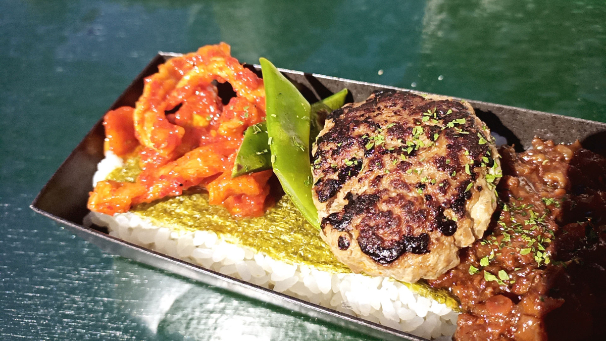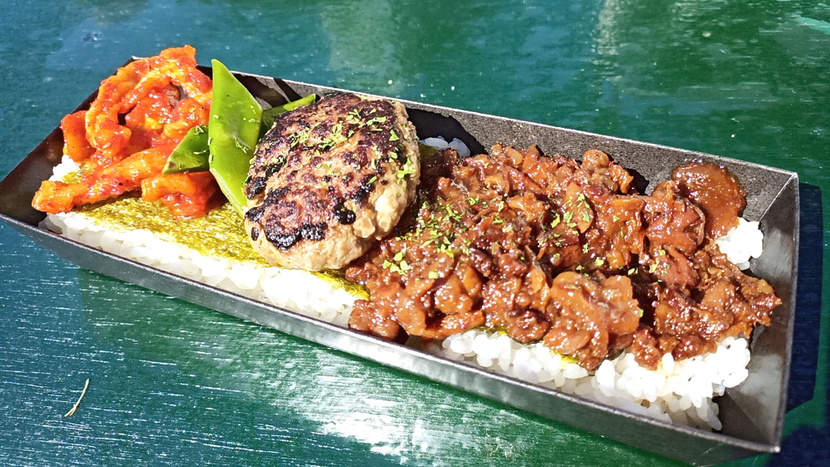 月形熟成牛を使用したハンバーグとしぐれ煮、キムチの乗ったお重